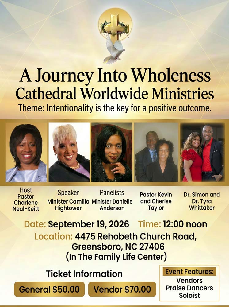 Join Host Pastor Charlene Neal-Keitt on September 19th, 2026 at her upcoming event entitled, “Intentionality Is The Key For A Positive Outcome.” Joining her are guest speakers Minister Camilla Hightower, Panelist Minister Danielle Anderson, Pastor Kevin and Cherise Taylor and Doctors Simon & Tyra Whittaker. The conference begins 12 noon at The Family Life Center, 4475 Rehobeth Church Road, Greensboro NC 27406. In addition to the speakers, there will be Vendors, Praise Dancers and Soloists. General Admission is $50 and your drivers license/ ID is all you will need will to get in. Limited seating, so don’t delay, register today!